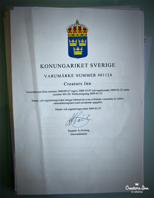 We registered Creators Inn as a trademark and got this nice certificate from The Kingdom of Sweden back.